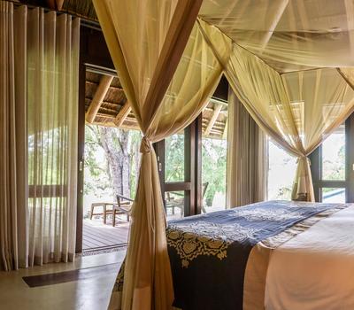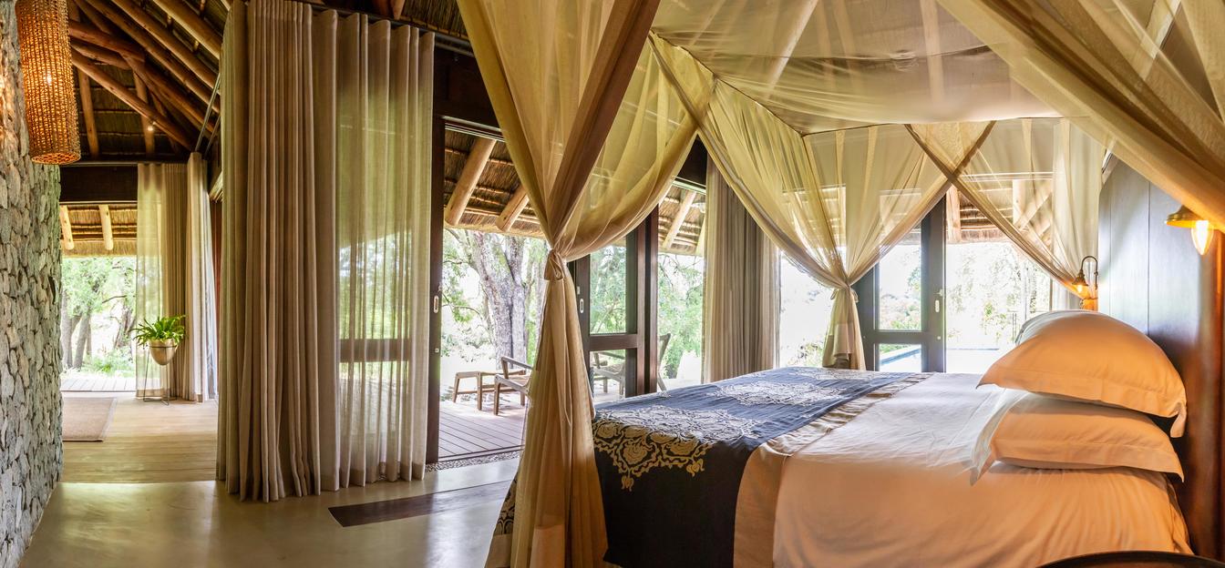 Cadascuna de les quatre suites expansives de Dulini Leadwood compten amb espais separats, però inter-líder, saló, dormitori i bany, amb finestres d'imatge de terra a sostre que emmarquen el pintoresc riu de sorra. La decoració és fastuosa però contemporània, des de parets de pedra i terres de cargolat fins a finestres d'imatges envoltades que permeten que les vistes del bushveld flueixin.