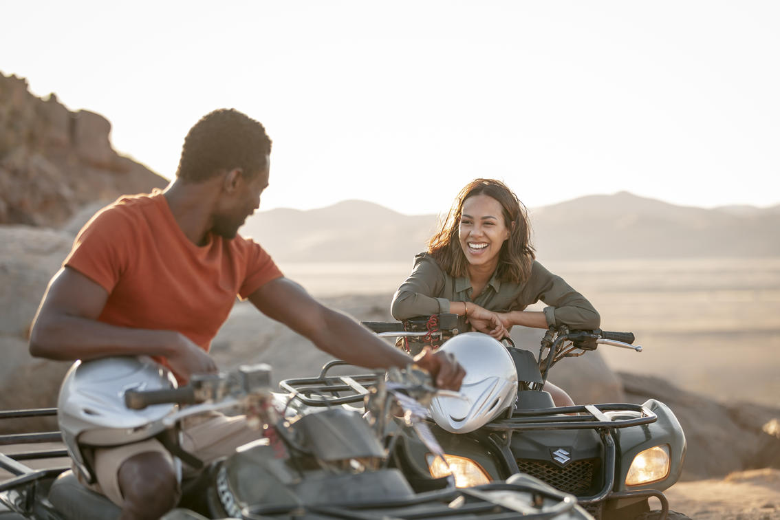 Udforsk Namibias naturlige vidundere og tag i de majestætiske landskaber, der kører eldrevne fedthjulede cykler. En spændende måde at udforske de fantastiske åbne sletter med din guide.