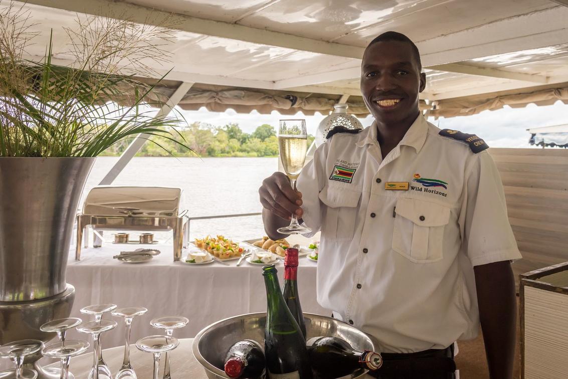 Die Zambezi River Sunset Cruise ist eine der beliebtesten Aktivitäten in den Victoria Falls. Die luxuriöse Zambezi Royal Cruise dauert in der Regel etwa zwei Stunden und erkundet Abschnitte des oberen Zambesi in der Nähe der Victoriafälle und weiter stromaufwärts, wo die Nationalparks Zambezi und Mosi-Oa-Tunya den Fluss flankieren. Freuen Sie sich auf 5-Sterne-Service, heiße und kalte Canapés, kreative Cocktails und eine Auswahl an Getränken. Der Kreuzfahrtkapitän wird eine kurze Präsentation über die Reise des Sambesi halten, während die Gäste die atemberaubende Landschaft am oberen Sambesi genießen.