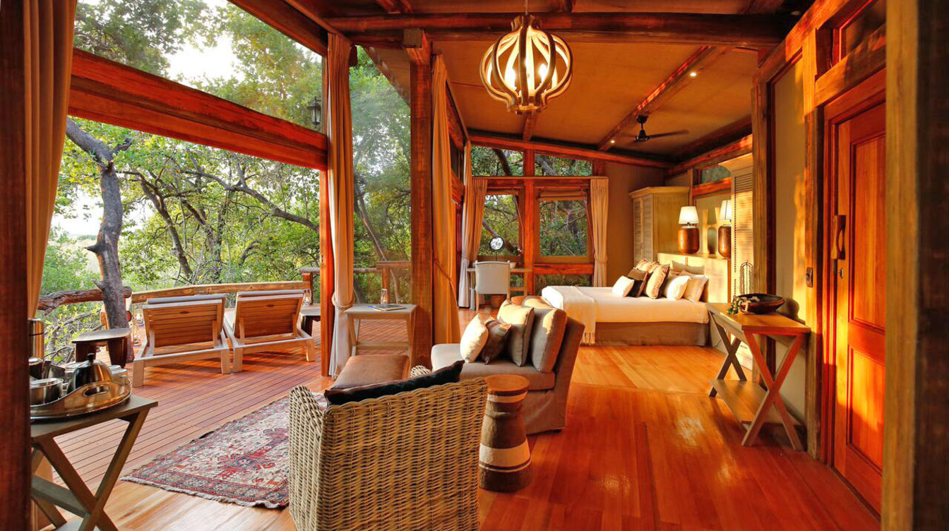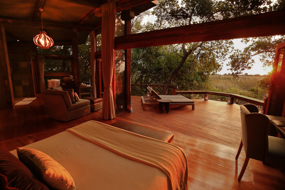 Luxurious elevated safari suite with double bedroom and stacking doors on an expansive Silligna platform