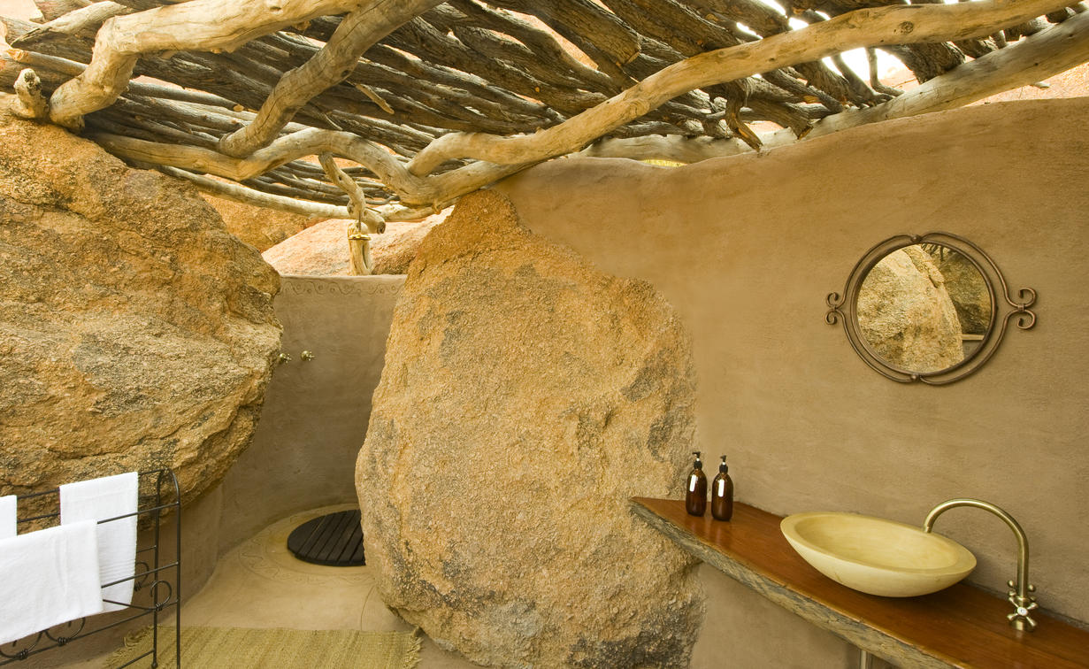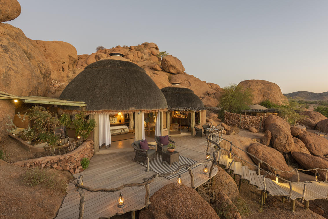 The Luxury Suites sit atop of the rocky outcrop and feature a large lounge with separate air-conditioned bedroom, and en-suite bathroom before spilling out on to a large deck with spectacular, uninterrupted views across the Damaraland landscape. Equipped with Wi-Fi, a stocked minibar, heated splash pool and private salas to soak up the vistas.