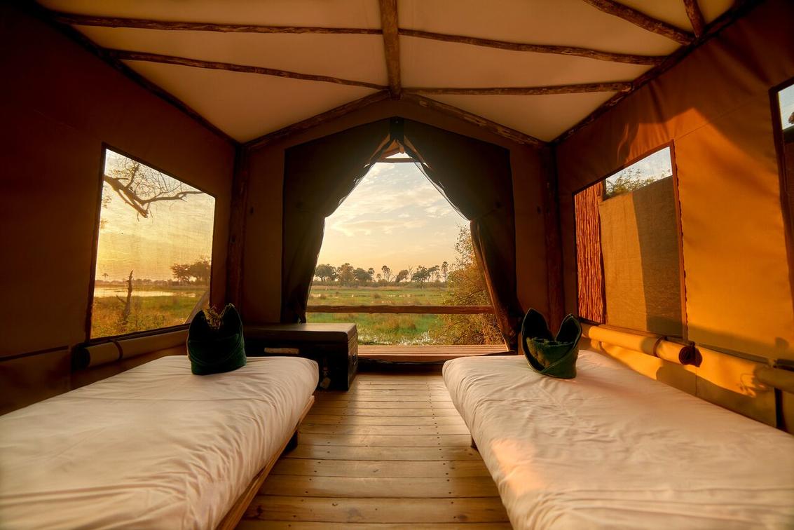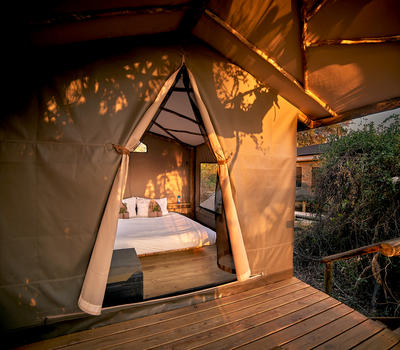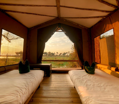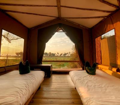 Accommodation is in simple, comfortable canvas 3m x 3m rooms set on elevated wooden decks, each with a view of the surrounding bush, and shaded by canvas shelters. Each tent has its own rustic en-suite facilities including hot and cold running water for the al fresco bucket shower – in true safari style.