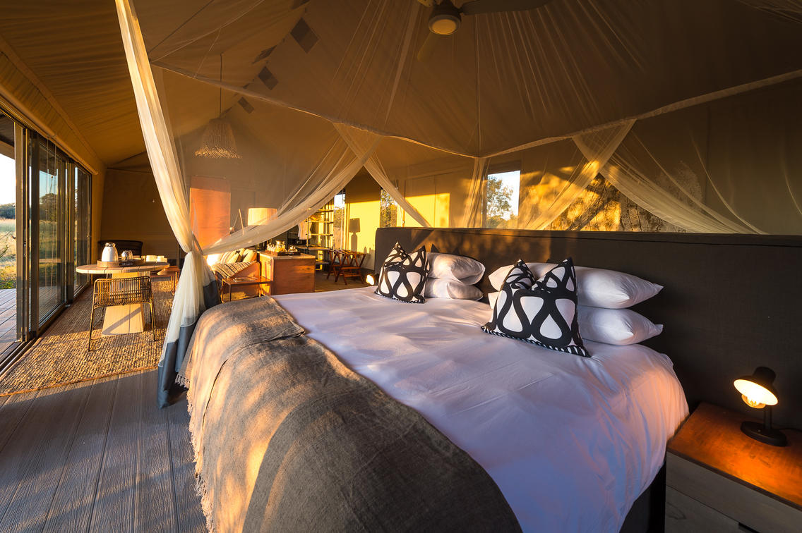 Wilderness Linkwasha's expansive canvas tented accommodations each look out onto the camp's waterhole, and beyond onto a vast plain. Elegant tents, featuring contemporary but timeless décor, nestle under leadwood trees, fronting a waterhole where the wildlife spectacle perpetually amazes and entertains.