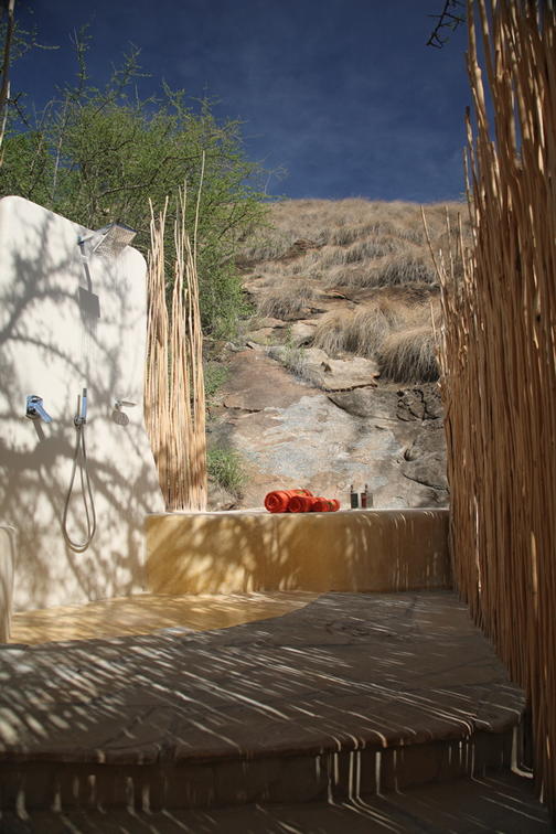 Villa Four is a large family villa with two separate bedrooms and two spectacular bathrooms with bath tubs and outdoor showers. The villa has a spacious sitting area and dining area for private dinners, a large and open veranda overlooking your own secluded and speculator view of Samburuland, and a fridge stocked with cold refreshments. Perfect for families or a group of friends, Villa Four is beautifully decorated and designed to blend into the natural surroundings.