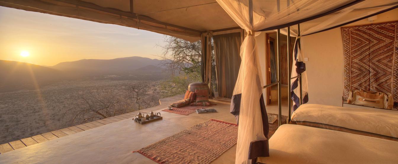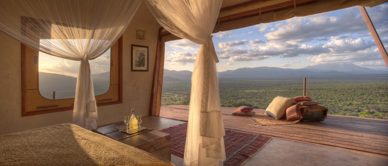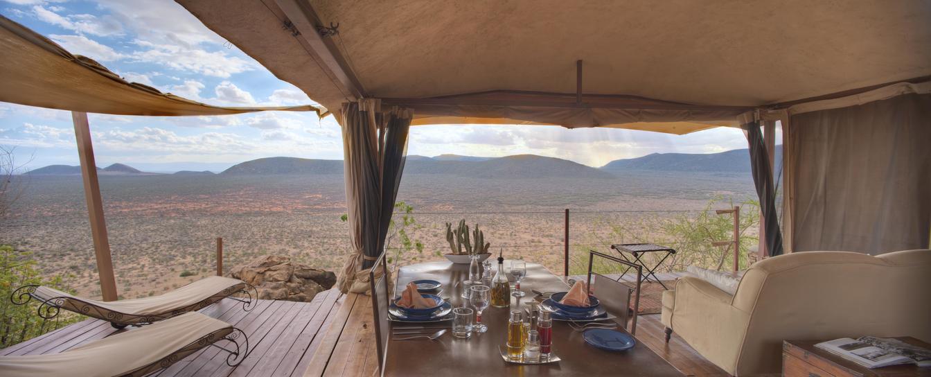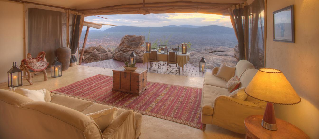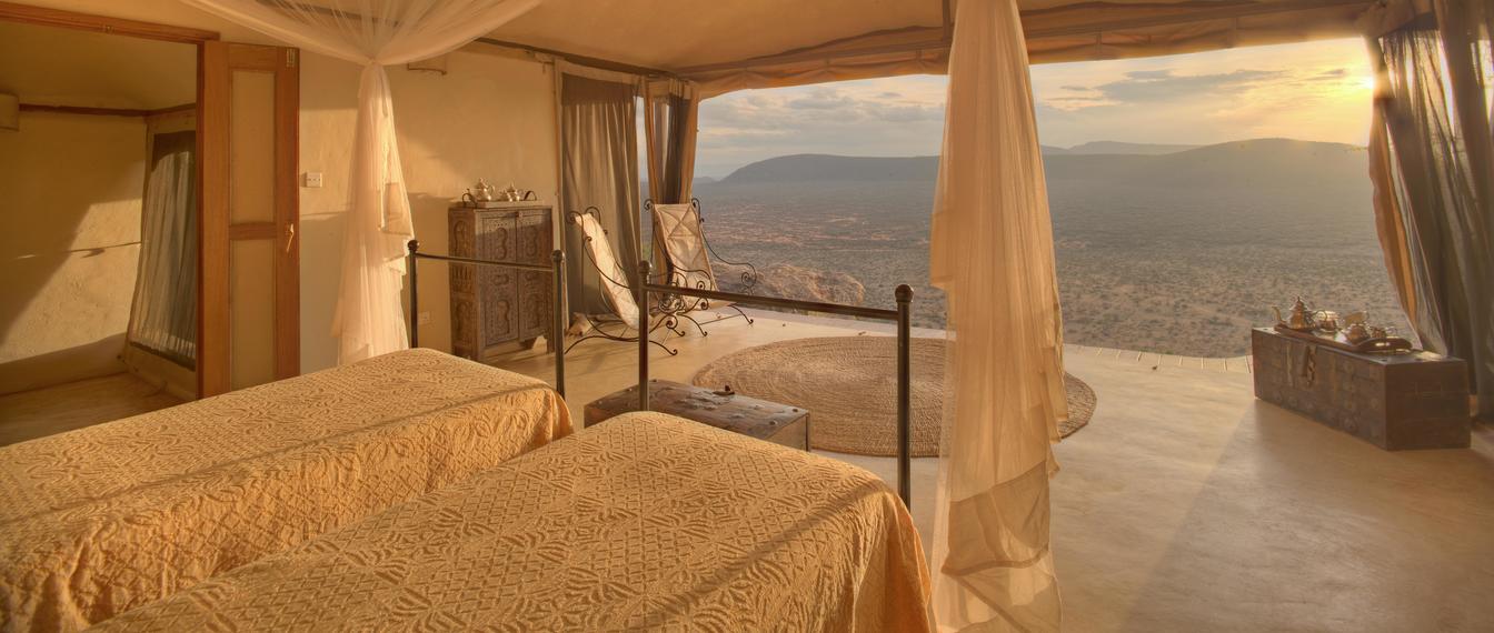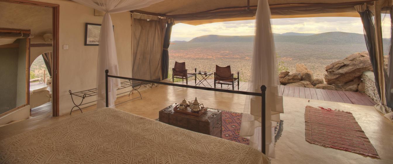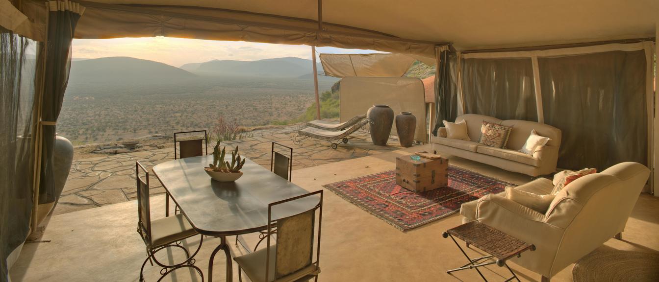 Villa Six, can be used as a large family villa with two separate bedrooms and two spectacular bathrooms with both indoor and outdoor showers. Or, the villa can be segregated into two separate entities for two different groups of guests. Each villa has a spacious living and dining area for private dinners, large veranda with the most magnificent view of the Northern Frontier Mountains, and a fridge stocked with cold refreshments. Perfect for families, groups of friends or for two separate groups of guests, Villa Six has a completely unique view different from any other accommodation throughout the lodge; its innovative location, the Swahili touches and the stylish furniture make it one of a kind.