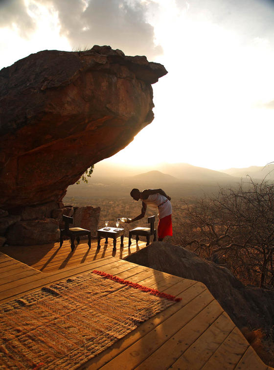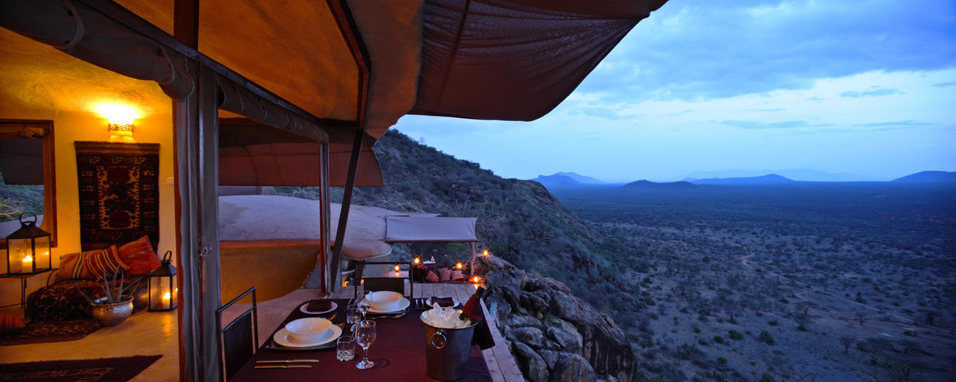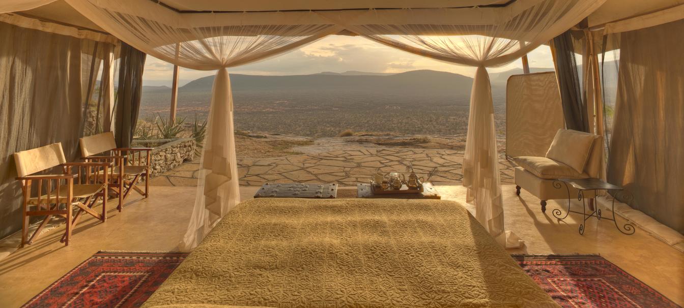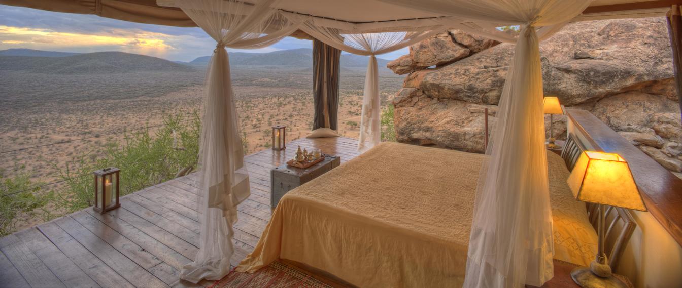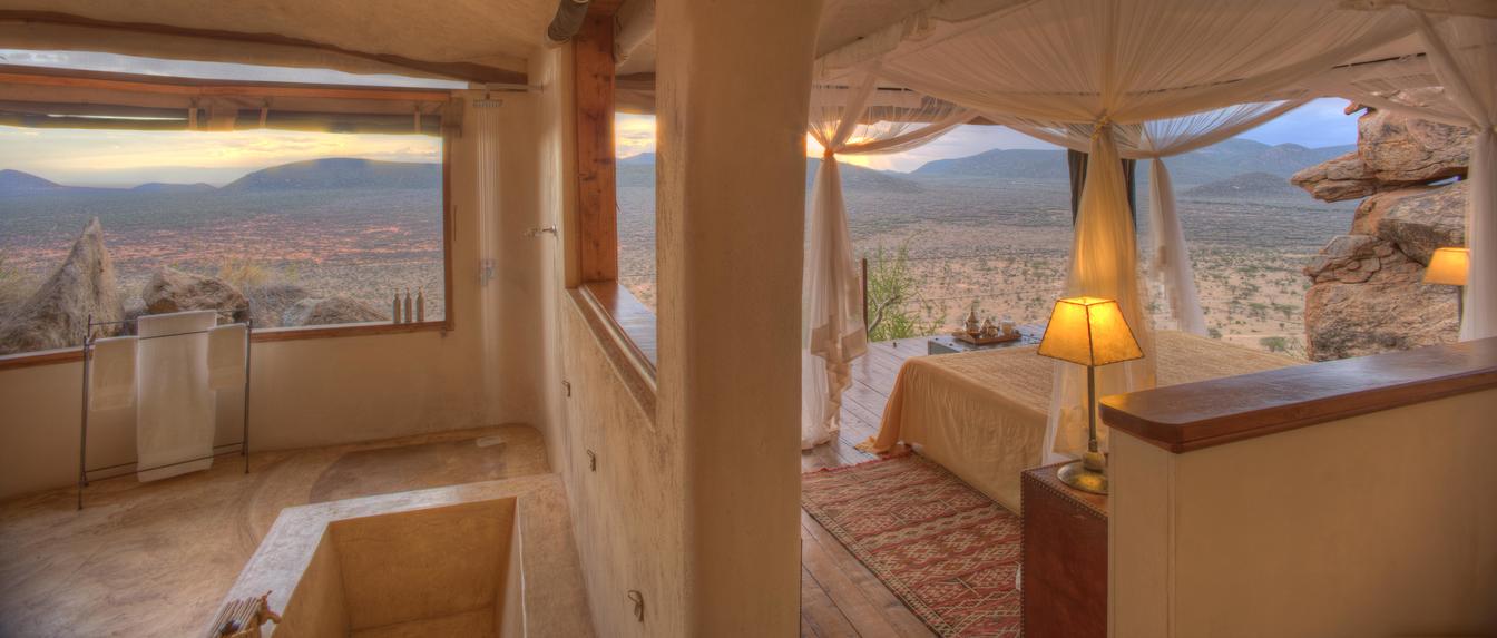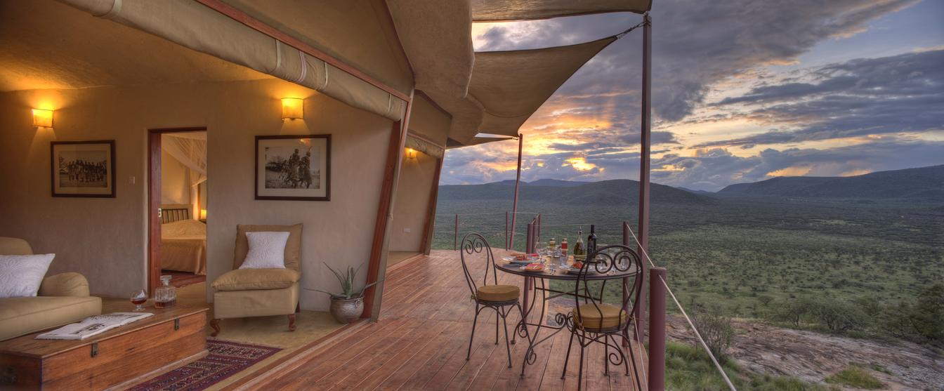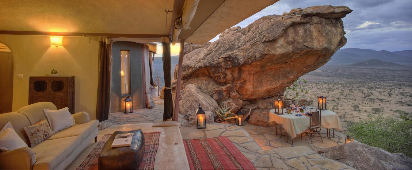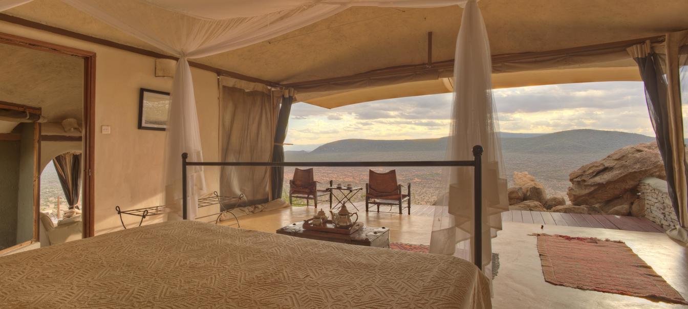 Villa Six, can be used as a large family villa with two separate bedrooms and two spectacular bathrooms with both indoor and outdoor showers. Or, the villa can be segregated into two separate entities for two different groups of guests. Each villa has a spacious living and dining area for private dinners, large veranda with the most magnificent view of the Northern Frontier Mountains, and a fridge stocked with cold refreshments. Perfect for families, groups of friends or for two separate groups of guests, Villa Six has a completely unique view different from any other accommodation throughout the lodge; its innovative location, the Swahili touches and the stylish furniture make it one of a kind.