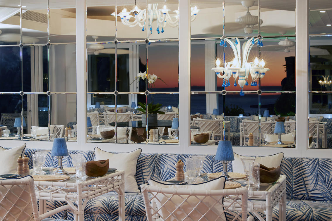 It’s a striking space of mirrored walls and picture windows letting natural light and panoramic views wash in. A handcrafted Murano glass chandelier hangs above and handblown Biot glassware from Provence graces the tables.