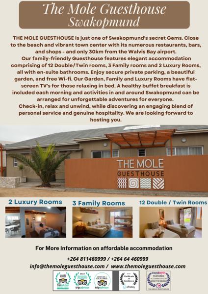 THE MOLE GUESTHOUSE is just one of Swakopmund's secret Gems. Close to the beach and vibrant town center with its numerous restaurants, bars, and shops - and only 30km from the Walvis Bay airport.