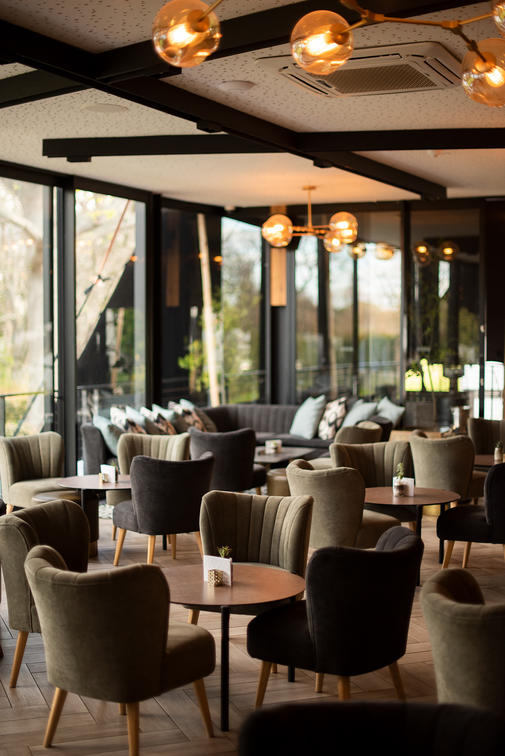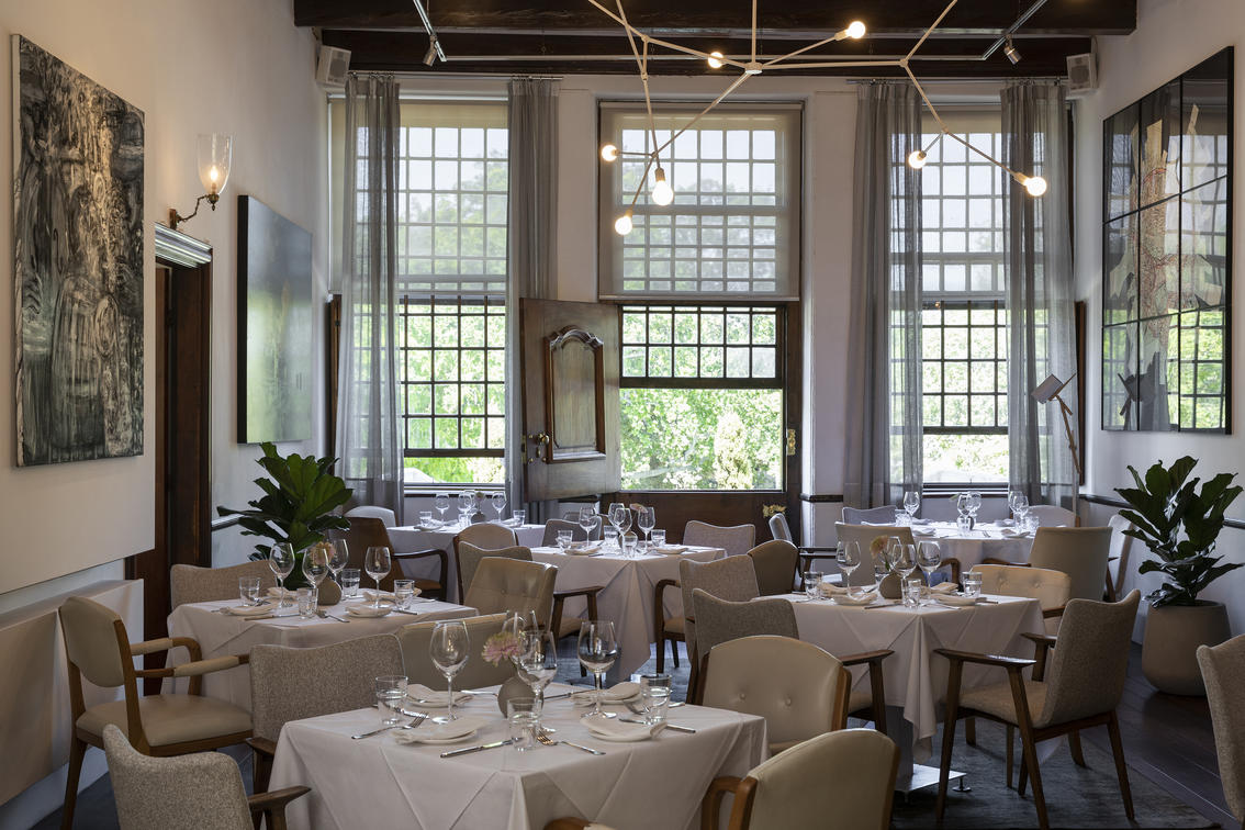 Dine inside in an intimate and refined yet cosy setting, or enjoy terrace dining under the oak trees.