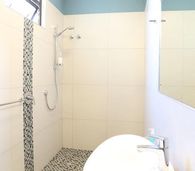 This room consists of a king sized bed, two single beds and a sleeper couch. The bathroom only has a shower.