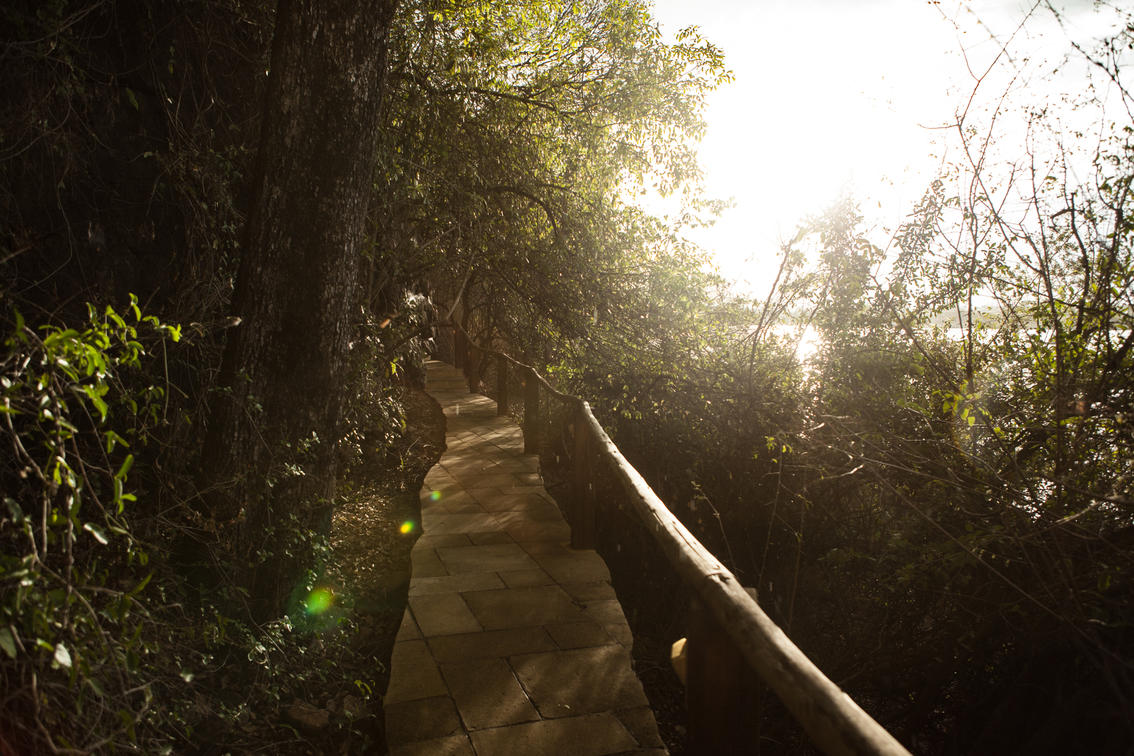At the end of the swimming pool, a hidden path winds along the cliff face to our secluded Tree House. Set against the basalt rock bed, amongst the branches of a riverine Ebony tree, this house spreads out over a sustainable pine deck that guarantees incredible views of the Zambezi River.