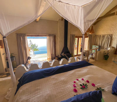 The Nut House is a haven from the elements. It is entirely enclosed but has light streaming in through every wall. The best art, textiles, and textures have been collected and combined from all around the African continent - from Morocco, Mali, Zambia, and South Africa just to start. This creates a lusciously romantic setting for relaxation, without losing an inch of the incredible river-view.