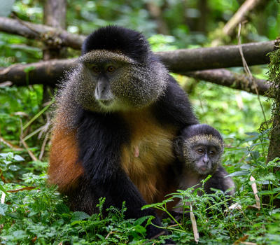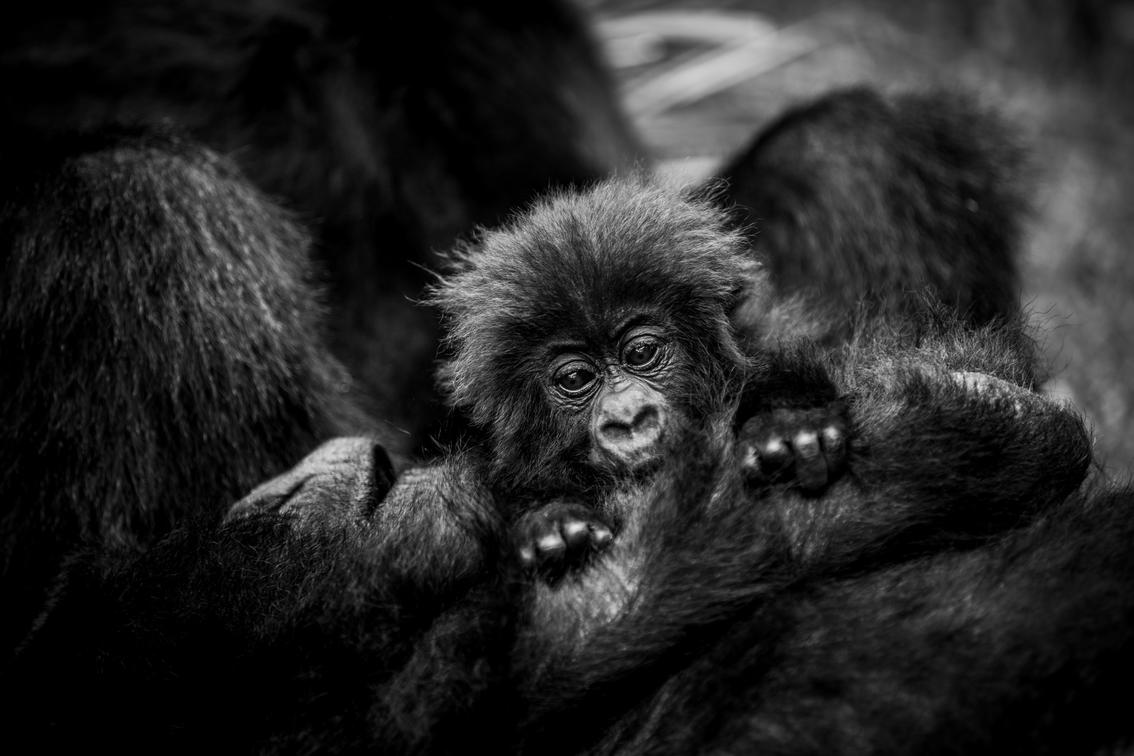 Young mountain gorillas stay close to their mothers up to the age of eight when they become more independent.