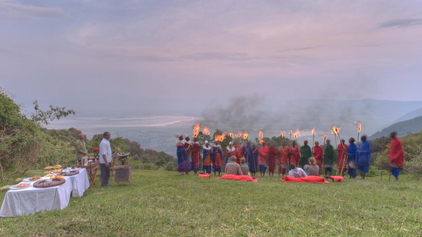 Haga un brindis por el sol poniente con un refrescante cóctel de sol en Gorgor (a poca distancia del lodge), en el borde del cráter. También te acompañarán 20 guerreros maasai que te serenarán con sus cantos y canciones tradicionales. Disfrute de unas vistas inolvidables y excepcionales oportunidades fotográficas.