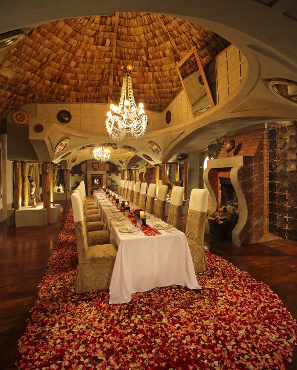 El comedor se transforma por arte de magia en un elegante banquete para un rey y una reina. La larga mesa de comedor iluminada con araña, adornada con lino, velas y ramos de rosas, está rodeada por una alfombra de pétalos de rosa de colores brillantes. Esta es la altura de la elegancia y el romance. En el lugar de cada huésped, una sola rosa se sienta encima de una tarjeta de menú bellamente presentada. Una suntuosa comida, preparada por expertos chefs, es servida por mayordomos atentos e incluye una copa de champán francés.