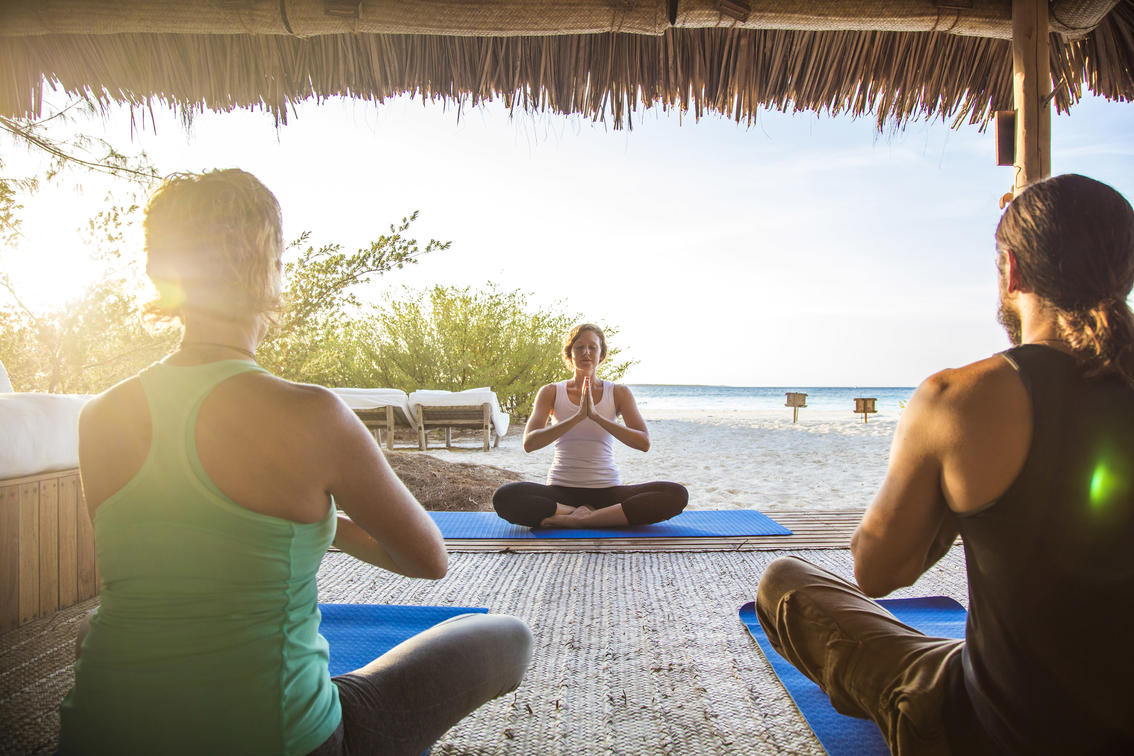 el océano prístino durante una clase de yoga. Adaptadas con habilidad para adaptarse a todos los niveles de experiencia, se pueden disfrutar de clases grupales diarias de yoga en el Wellness Banda, en la terraza de yoga, junto con otras sesiones de sanación restauradora, como la meditación con cuencos cantantes.
