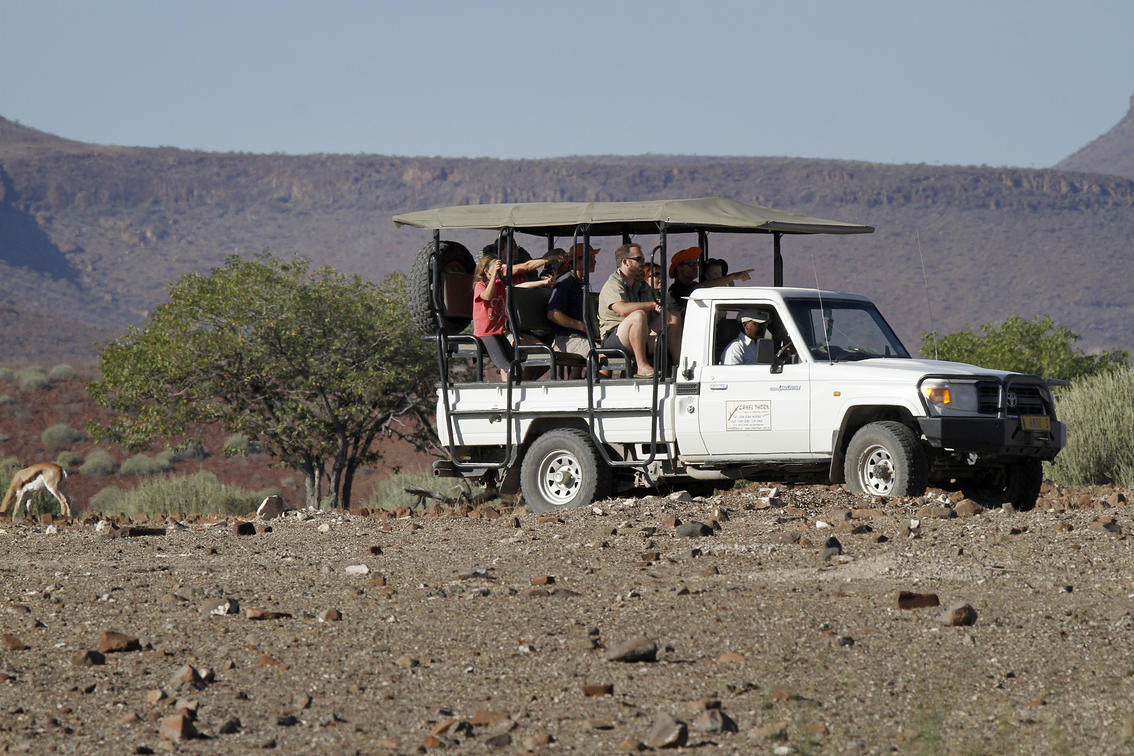 Faîtes confiance à notre guide expérimenté et suivez la trace du rhinocéros noir. Un véhicule de safari vous conduira à travers la Concession de Palmwag. Le pistage du rhinocéros s'effectue à pied.