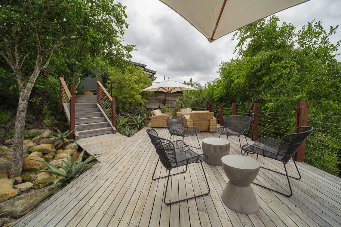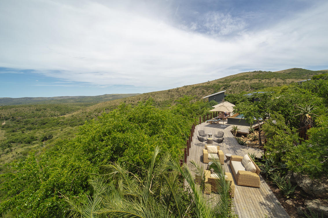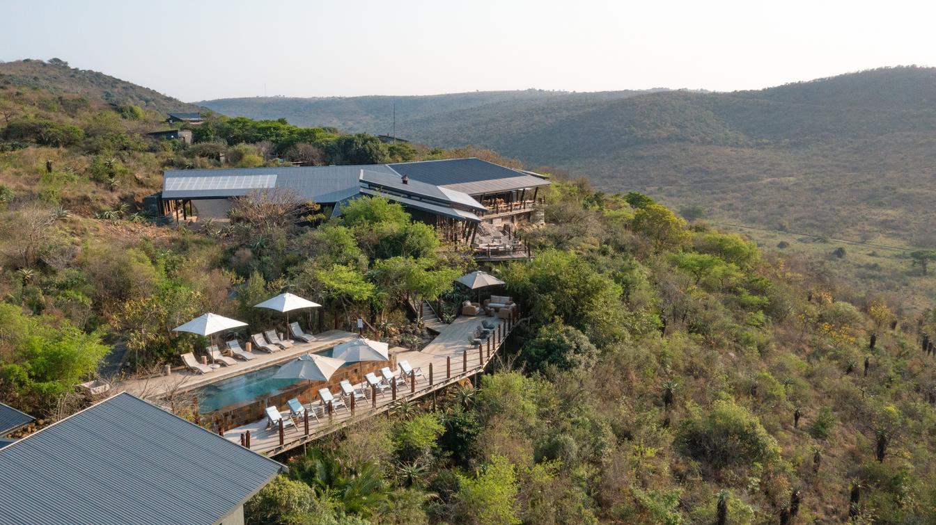 Vue aérienne de la terrasse de la piscine et de la zone de détente.