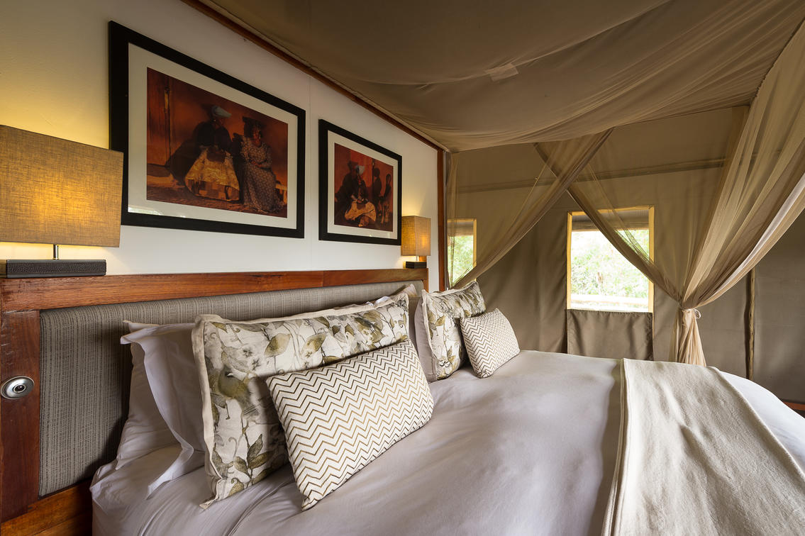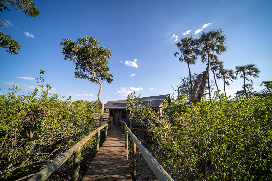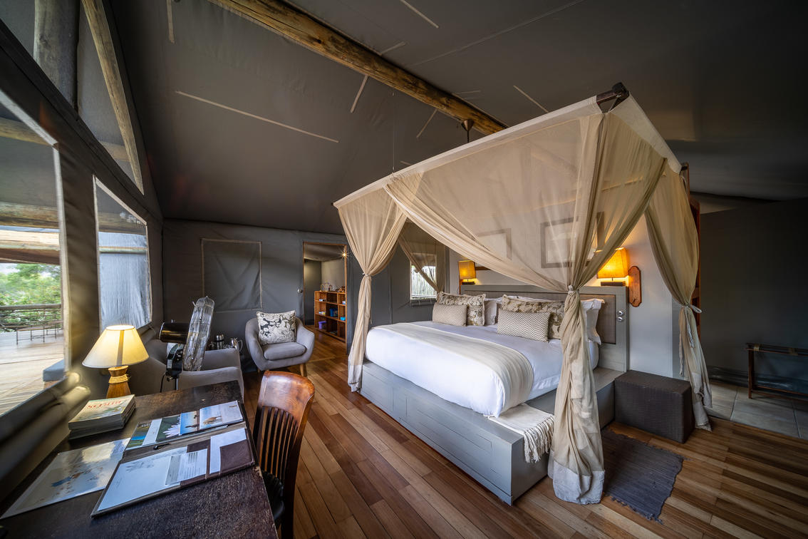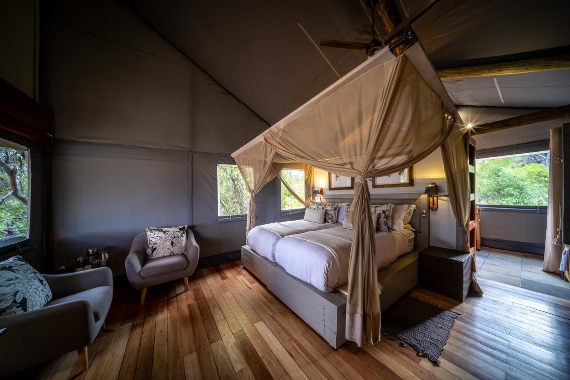 Alle grote tentkamers met canvas zijn verhoogd en kijken uit op een lagune die een ononderbroken uitzicht biedt. Ze zijn ontworpen in zachte, neutrale tinten en hebben elk een eigen badkamer en een eigen terras — de perfecte plek om te ontspannen en de voorbijkomende wilde dieren te observeren. Ze zijn allemaal prachtig ingericht, met ontspannen comfort — van houten vloeren bezaaid met vloerkleden tot fris beddengoed en zachte kussens.