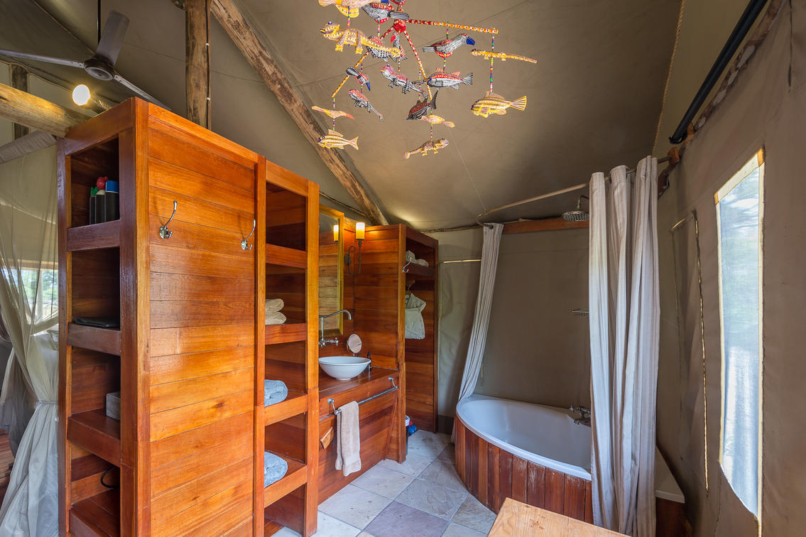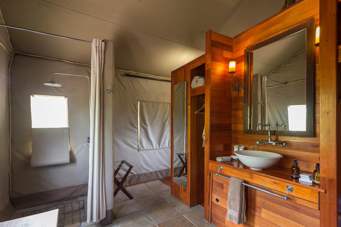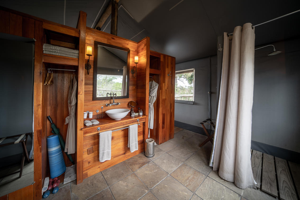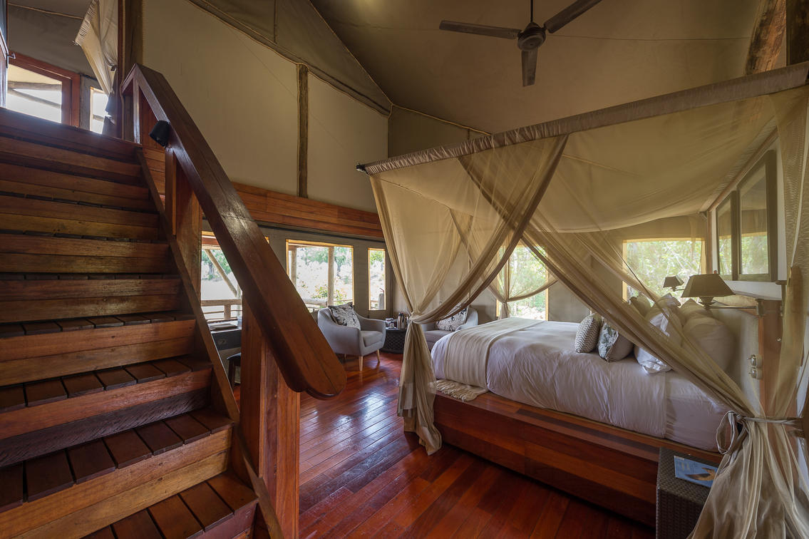 Alle grote tentkamers met canvas zijn verhoogd en kijken uit op een lagune die een ononderbroken uitzicht biedt. Ze zijn ontworpen in zachte, neutrale tinten en hebben elk een eigen badkamer en een eigen terras — de perfecte plek om te ontspannen en de voorbijkomende wilde dieren te observeren. Ze zijn allemaal prachtig ingericht, met ontspannen comfort — van houten vloeren bezaaid met vloerkleden tot fris beddengoed en zachte kussens.